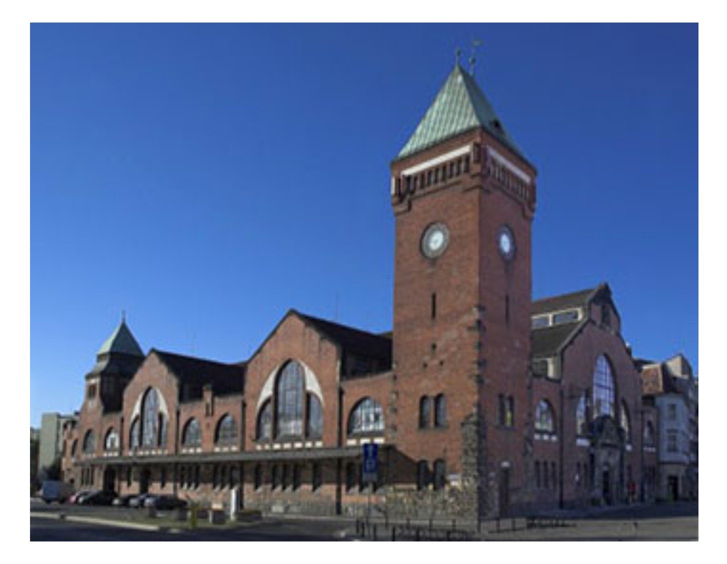 - Portale główne 2 szt. - secesja 1908 r. piaskowiec Autor: Kiunka wymiar: 8,0 m x 7,93 m wschodnia i zachodnia elewacja Hali. Przejazd bramny od bocznych przejść pieszych dzielą ażurowe galeryjki /wymiary 3,0m x 2,0m/.